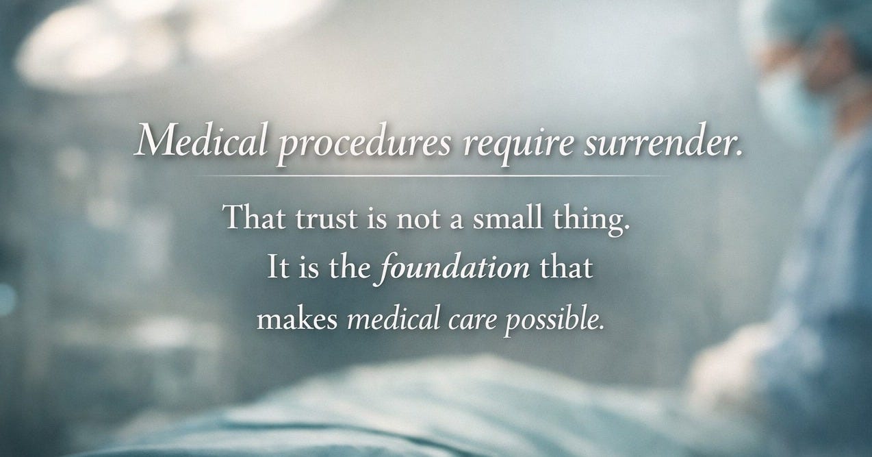 Medical procedures require surrender. A patient lies still while someone else approaches the most fragile parts of their body. They trust that the plan discussed beforehand is the plan that will be followed. That trust is not a small thing. It is the foundation that makes medical care possible.